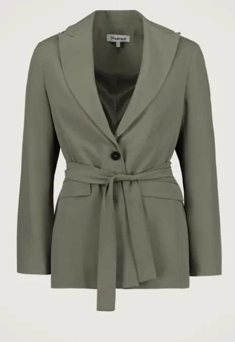 Dit is de Moy Blazer van het merk Madness. Deze blazer heeft een lichte ribstructuur heeft een reverskraag, twee fake klepzakken, en een knoopsluiting. Het item heeft een bijpassend ceintuur.