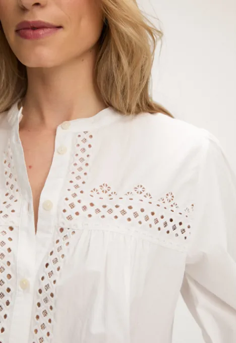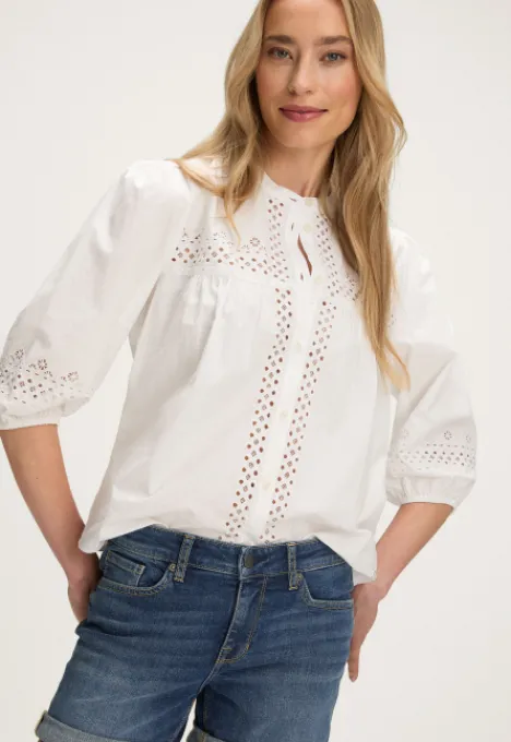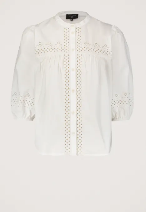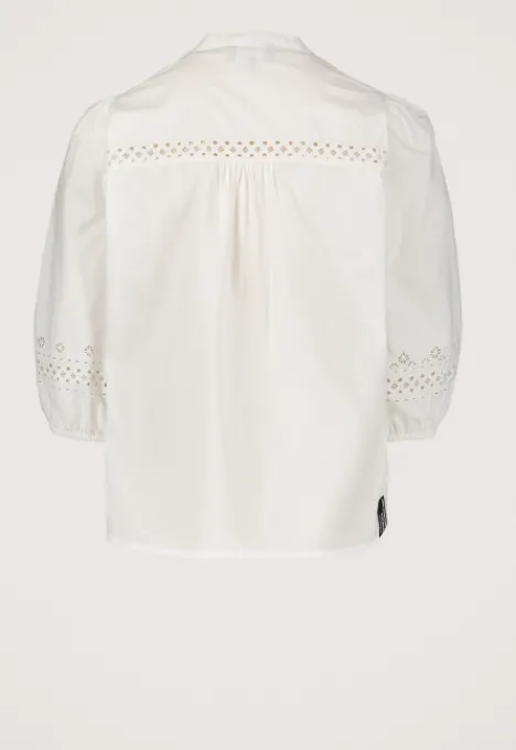 Dit is de Kabi Blouse van het merk Silvercreek. De blouse heeft een ronde hals, driekwart pofmouwen en een knoopsluiting. Verder heeft de blouse een open geborduurd detail op de borst, op de rug, langs de sluiting en onderaan de mouwen. Op de voorkant van de blouse zit een plooi detail en de mouwboorden zijn elastisch.