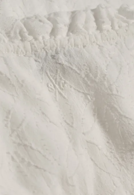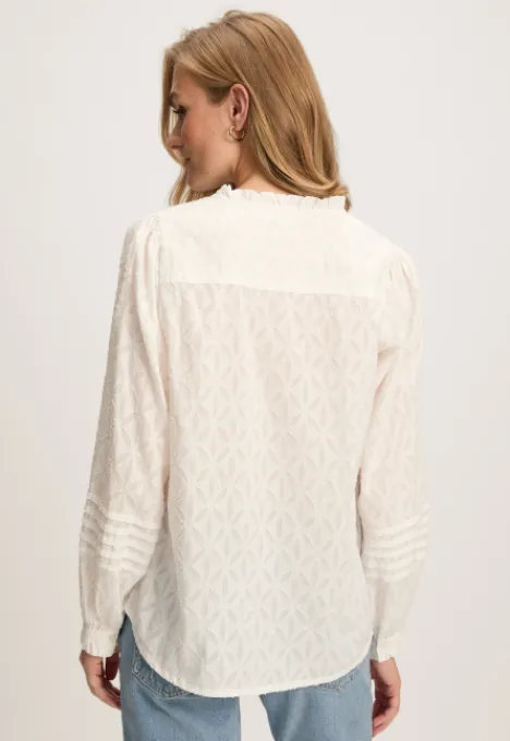 Dit is de Kamilla Blouse van het merk Silvercreek. Deze blouse heeft een ronde hals met een spit en een knoopsluiting bovenaan de hals. De boorden zijn afgewerkt met een ruffle accent en onderaan de mouw heeft de blouse een rib detail. De blouse heeft een all over patroon.