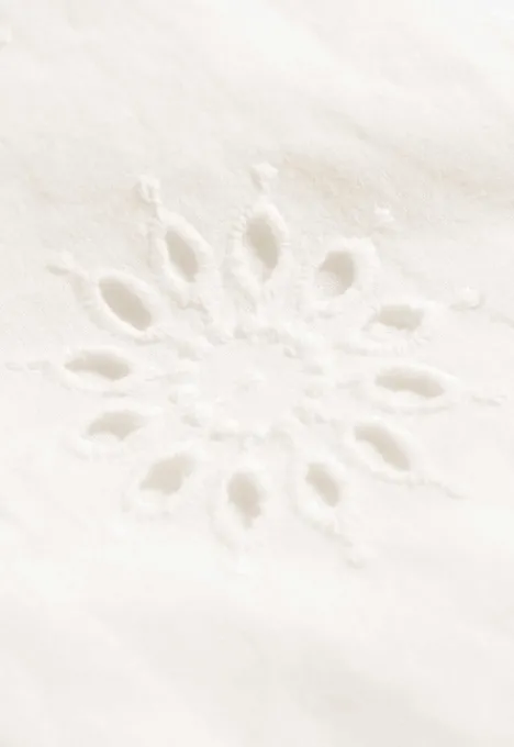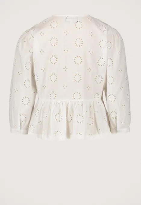 Dit is de Minzy Blouse van het merk Madness. De blouse heeft een V-hals en driekwart mouwen. Verder kan je de blouse aan de voorkant dichtmaken door middel van drie strikjes. Het item heeft aan de onderkant een ruffle en heeft een all over broderie.