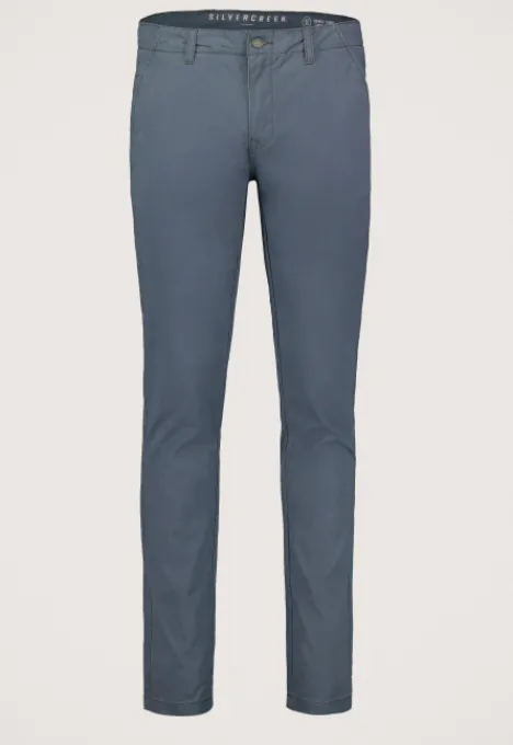 Dit is de Bench Chino van het merk Silvercreek.Deze chino heeft aan de voorkant 2 schuine steekzakken en is afsluitbaar met de bijbehorende rits- en knoopsluiting.Het kenmerkende Silvercreek logo is ook geplaatst bij de rechter broekzak, zowel aan de voor- als aan de achterkant.