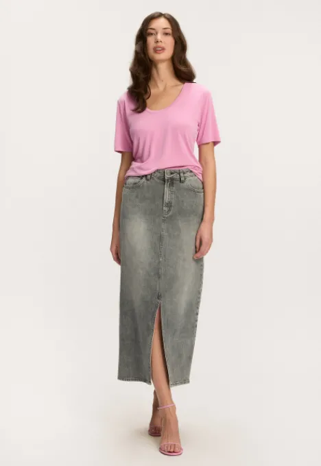 ProductomschrijvingDit is de Thilou Denim Rok van het merk Silvercreek. Deze lange denim rok heeft 5 zakken, een split a…