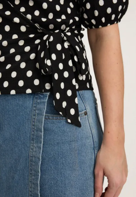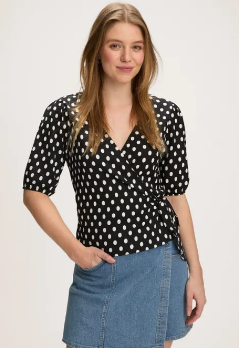 Dit is het Maritza T-shirt van het merk Madness. Het T-shirt heeft een overslag met striksluiting en een V-hals. Verder heeft het T-shirt een subtiele pofmouw met een elastische boord.