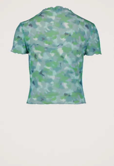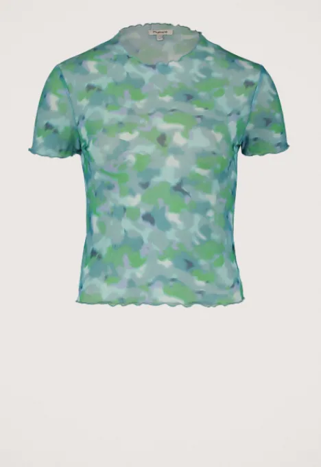Dit is het Marlena T-Shirt van het merk Madness. Het mesh T-shirt heeft een ronde hals, korte mouwen en is gemaakt van een stretch stof. Verder heeft het T-shirt een all over print en geruffelde zoomen.