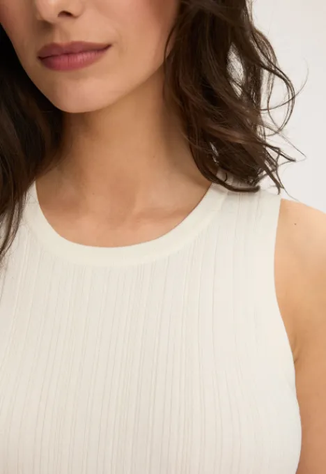 Dit is de Patti Top van het merk Silvercreek. De top heeft een ronde hals, is mouwloos en heeft rib gebreide hals- en mouwboorden. Verder zit er een streeppatroon in de stof en de stof is erg elastisch.