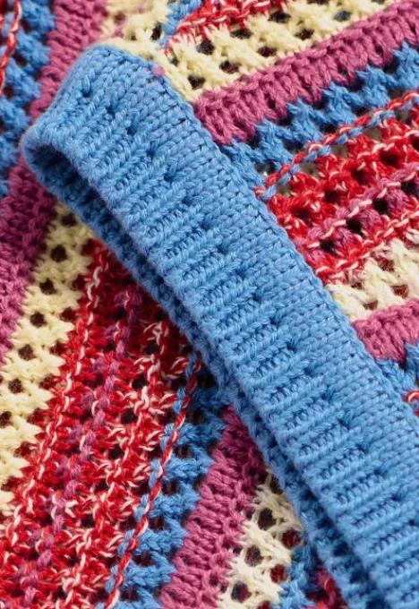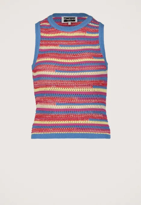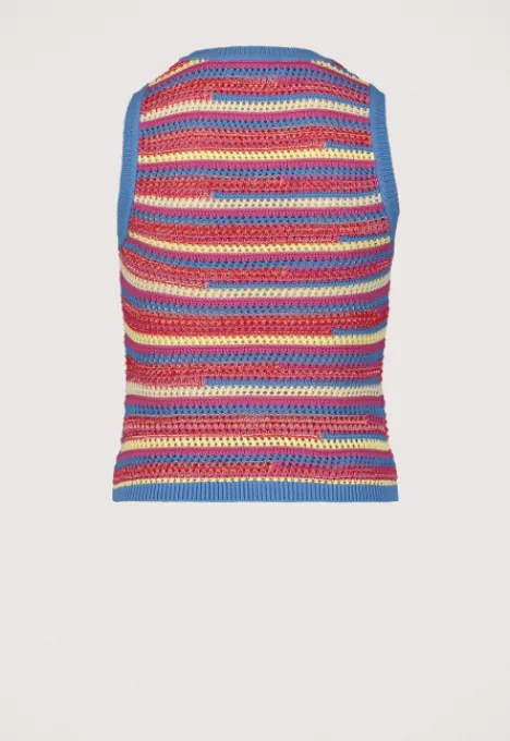 Dit is de Mayte Spencer van het merk Madness. De opengewerkte spencer is mouwloos en heeft een ronde hals. Verder heeft de spencer een gebreid streeppatroon en ribgereide zoomen.